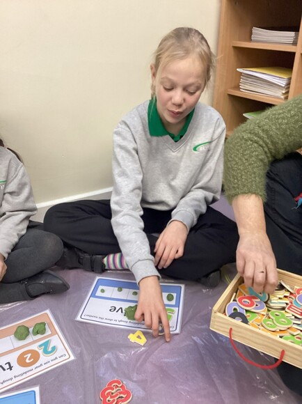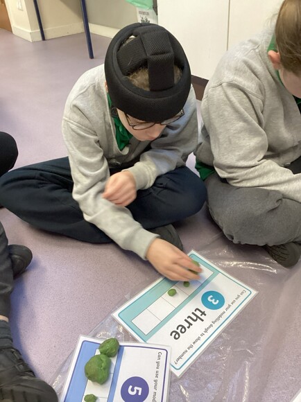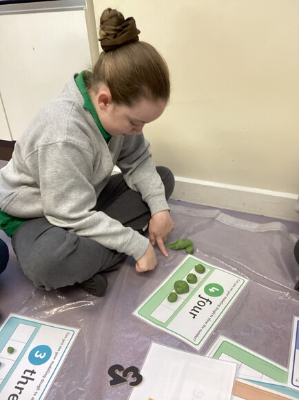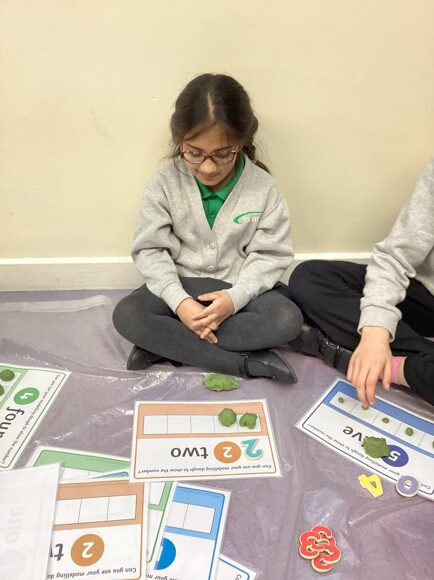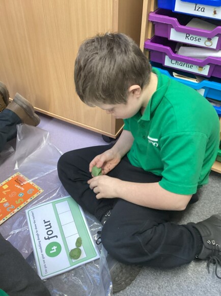 These are pictures showing the children working on consolidating their understanding of the numbers 0 – 5. They had to pick a board, recognise the number, and then roll out that many balls of dough and put them in the 5-frame. They also had to try and find a loose, matching numeral. They all did well with this and are starting to realise that if a 5-frame is full, they don’t need to count the amount, they can just say, ‘5!’